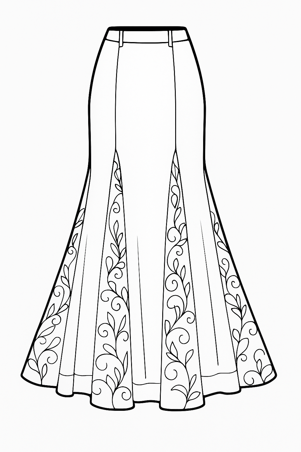 Юбка тренировочная, длина - по-щиколотку. Кокетка – двухслойная, на скрытой резинке. Полотнище юбки - солнце. Центральная часть переднего и заднего полотнища чуть длиннее, чем боковая.