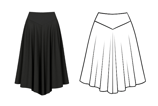 Юбка тренировочная, длина - по-икру. Кокетка – двухслойная, на скрытой резинке. Полотнище юбки - солнце. Центральная часть переднего и заднего полотнища чуть длиннее, чем боковая.